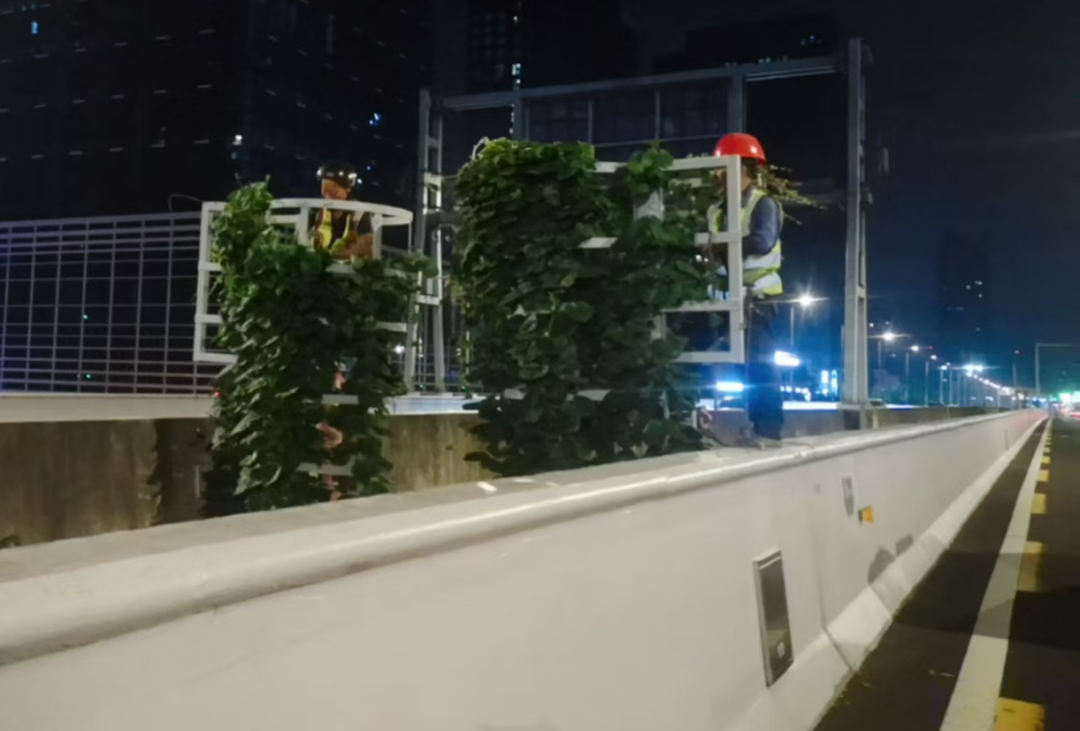 因二环高架属于城市主干道,施工最重要的就是安全问题。为确保作业的安全性,绿化工人们的工作都集中在夜间凌晨至5:30这一时间段进行。每次施工时,要先设置安全标志标识,放置锥形桶、设置警示灯,然后由两人一组为单位,才能开始施工作业。