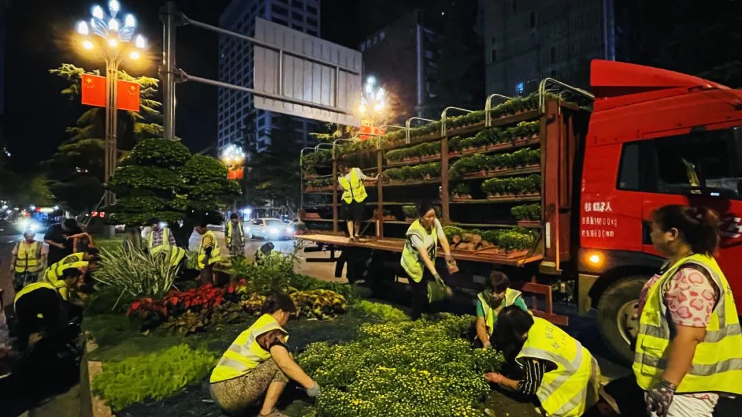 白天修剪忙,夜晚也不停歇。为避免影响市民游客出行与城市交通秩序,换花、补栽等景观提升工作多安排在晚间九点后开展。运花车辆抵达前,城市各主要点位的草坪及景观带旁,园林工人已分组行动,松土、除草、拔除枯萎植株,有条不紊地为新花卉栽种腾出空间。